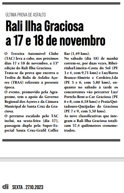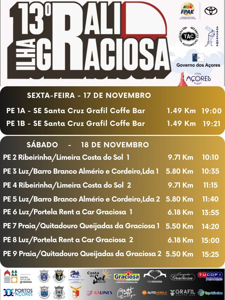 O Terceira Automóvel Clube (TAC) leva a cabo, nos próximos dias 17 e 18 de novembro, a 13ª edição do Rali Ilha Graciosa, a prova que encerra o Troféu de Ralis de Asfalto Açores (TRAA).